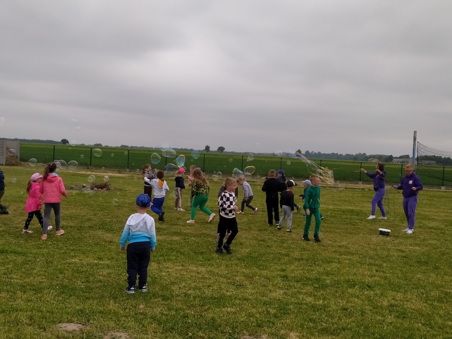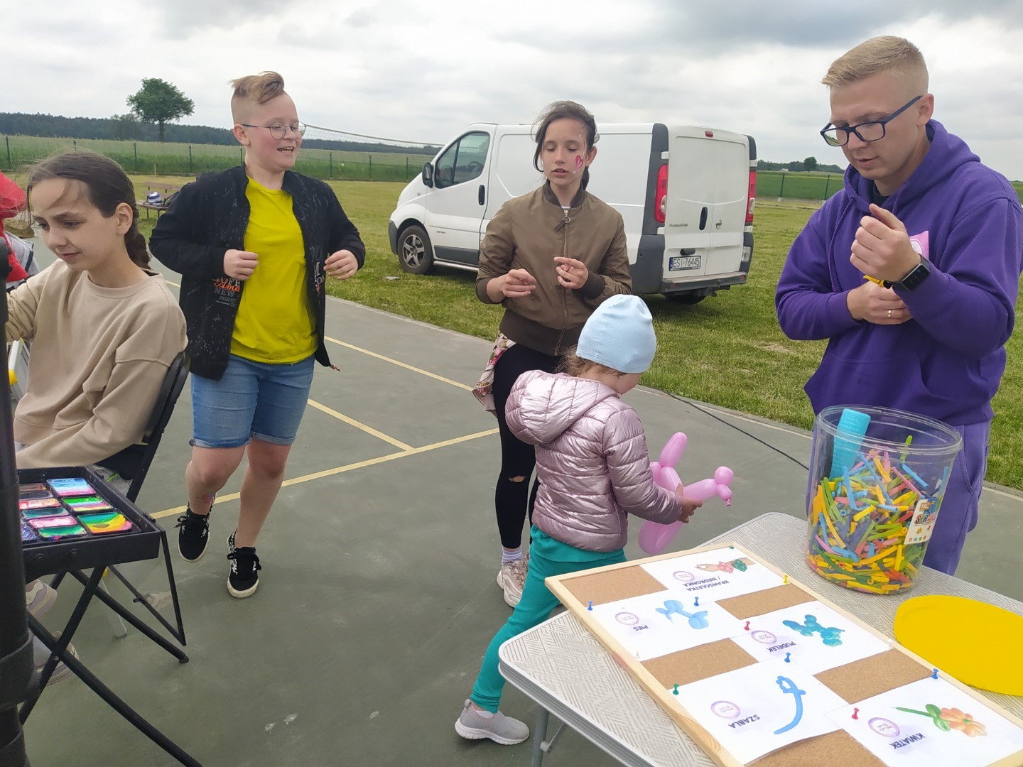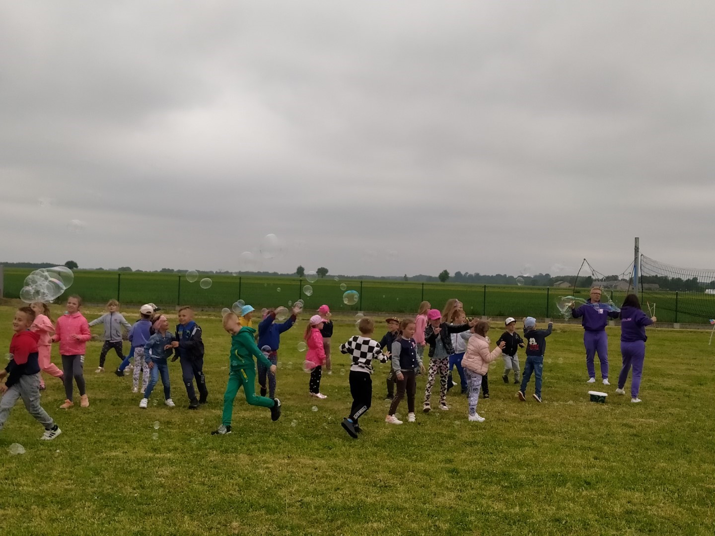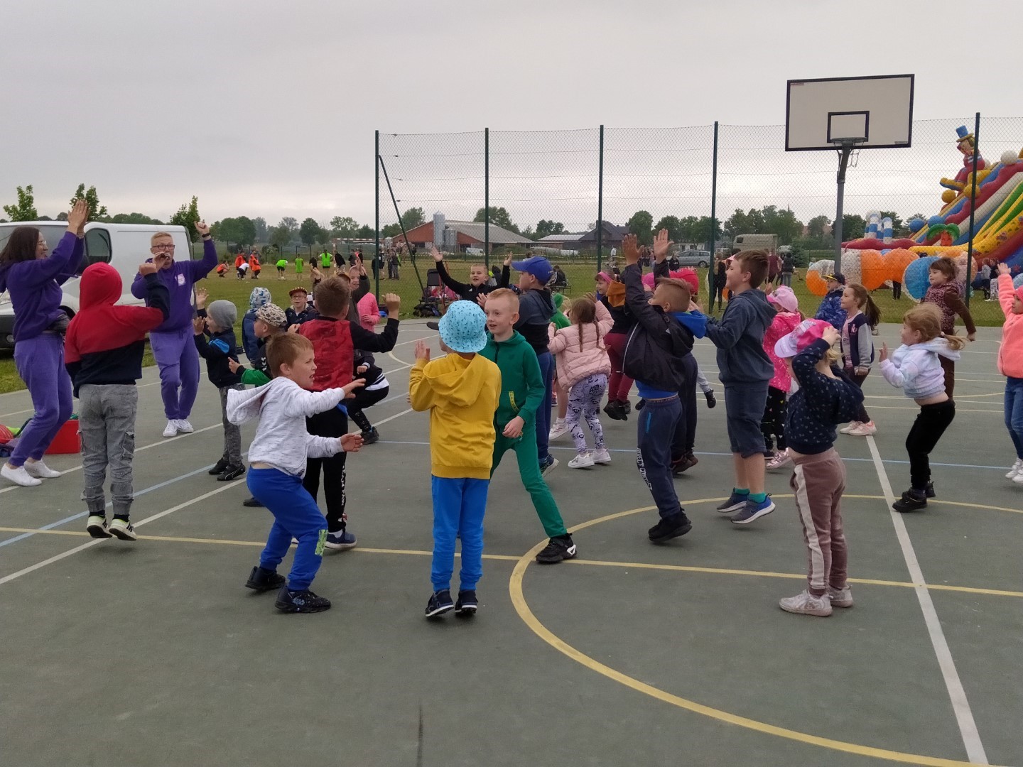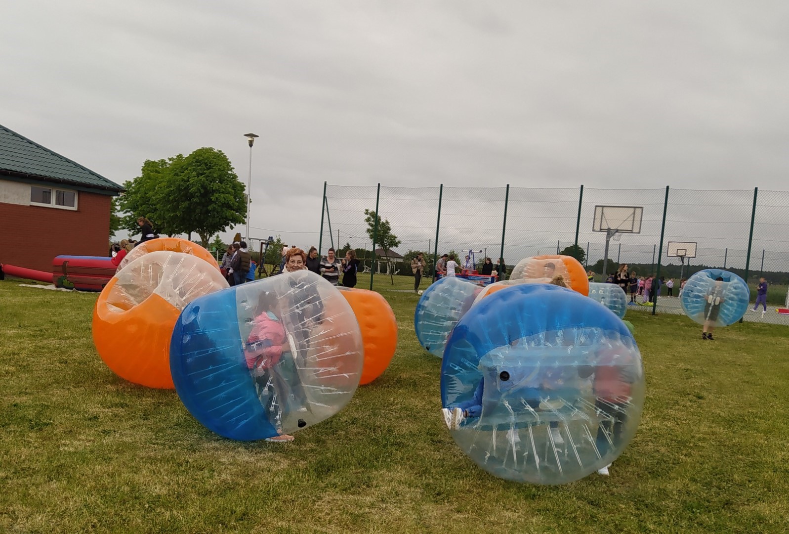 Impreza odbywała się na szkolnych boiskach, jednak echo zabawy roznosiło się po całej okolicy. Już kilka minut po godzinie ósmej entuzjaści piłki nożnej usłyszeli pierwszy gwizdek rozpoczynający turniej piłkarski. Piłka nożna cieszy się coraz większym zainteresowaniem i wzbudza wiele emocji, a liczba fanów tej konkurencji sportowej ciągle wzrasta. Nic więc dziwnego, że rozgrywki przyciągnęły wielu kibiców, którzy dopingowali swoich faworytów oraz cieszyli się ze zwycięstwa  i zdobytych punktów. Dzieciaki mogły wybawić się również na trampolinach. Ponadto (podobnie jak w ubiegłym roku) w szkole gościł „Wesoły Duecik”. Animatorzy przygotowali mnóstwo atrakcji. Były ogromnych rozmiarów bańki mydlane,  konkursy, iluzja, malowanie twarzy oraz dużo muzyki. Niecodzienną darmową atrakcją były również ogromne zjeżdżalnie. Chyba wszyscy skorzystali z „Giganta” i odwiedzili „Chatkę Smerfów”. Maluszki z uśmiechem na twarzy wskakiwały w kolorowe kulki, natomiast trochę starsi sprawdzali swoją sprawność na byczku, który choć trochę nerwowy, nie wyrządził nikomu krzywdy. Dużym powodzeniem cieszyły się dmuchane kule Bumper Ball. Dzięki nim uczniowie, pomimo różnicy wzrostu, mogli biegać, zderzać się ze swymi kolegami oraz bez obaw upadać na ziemię.