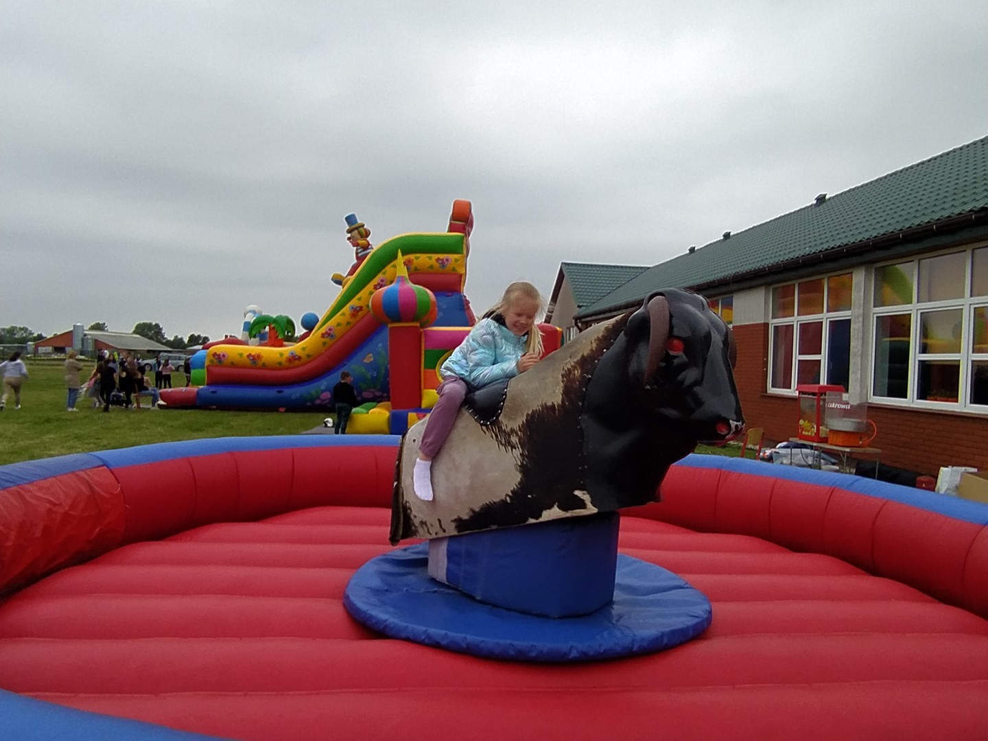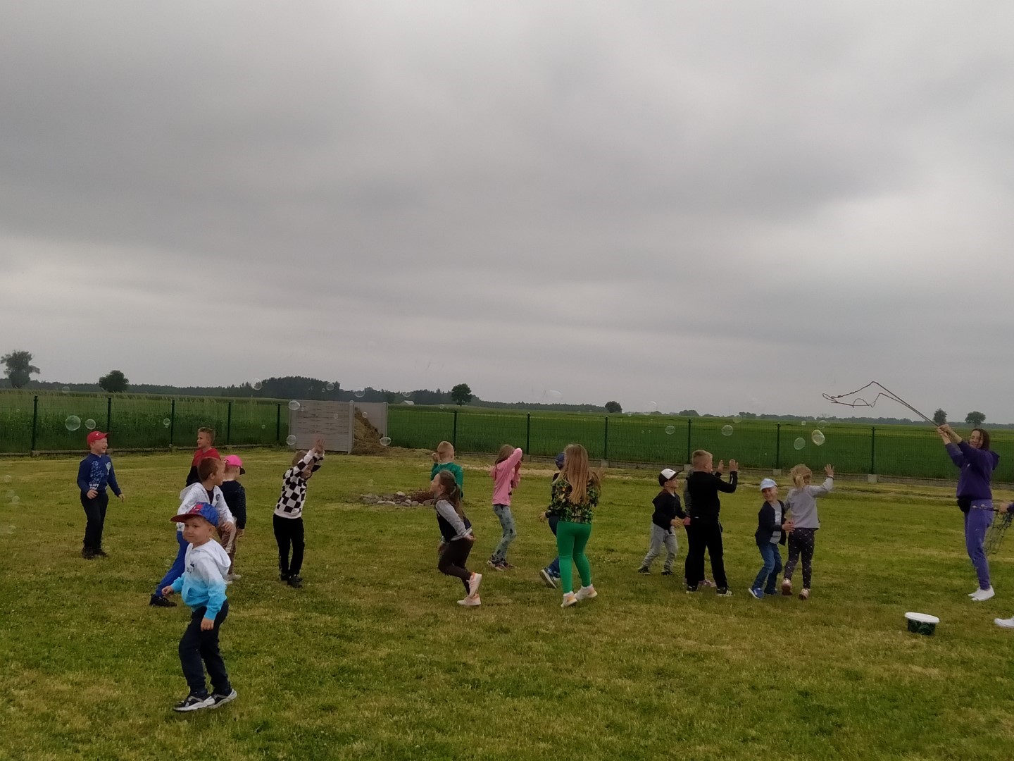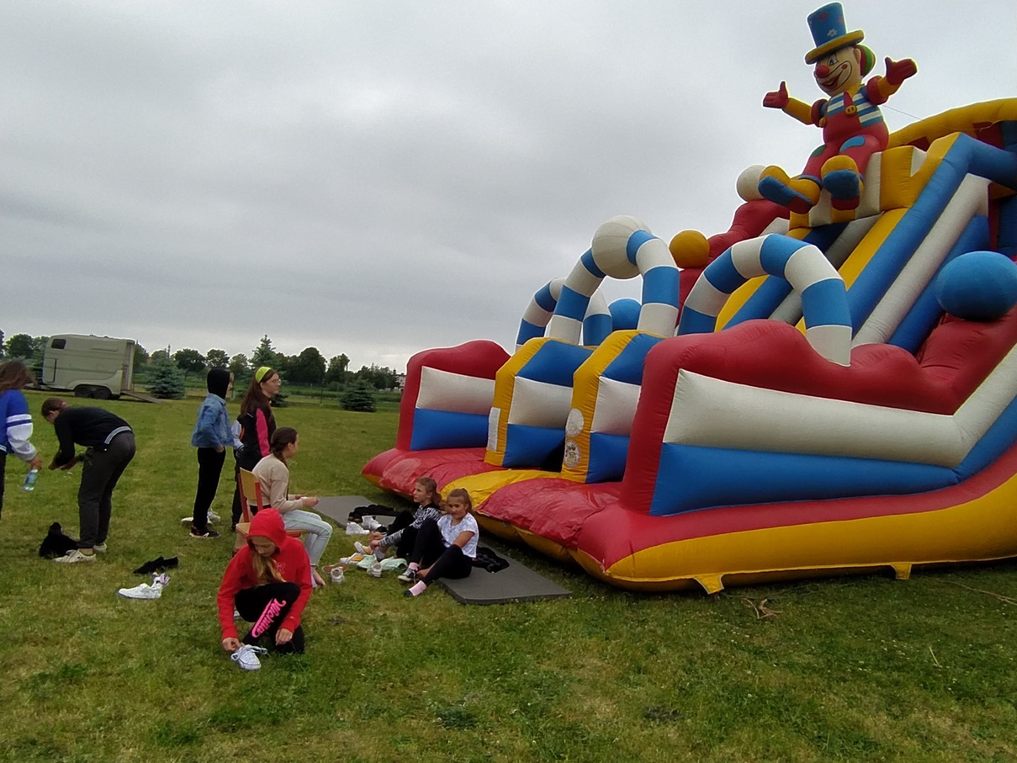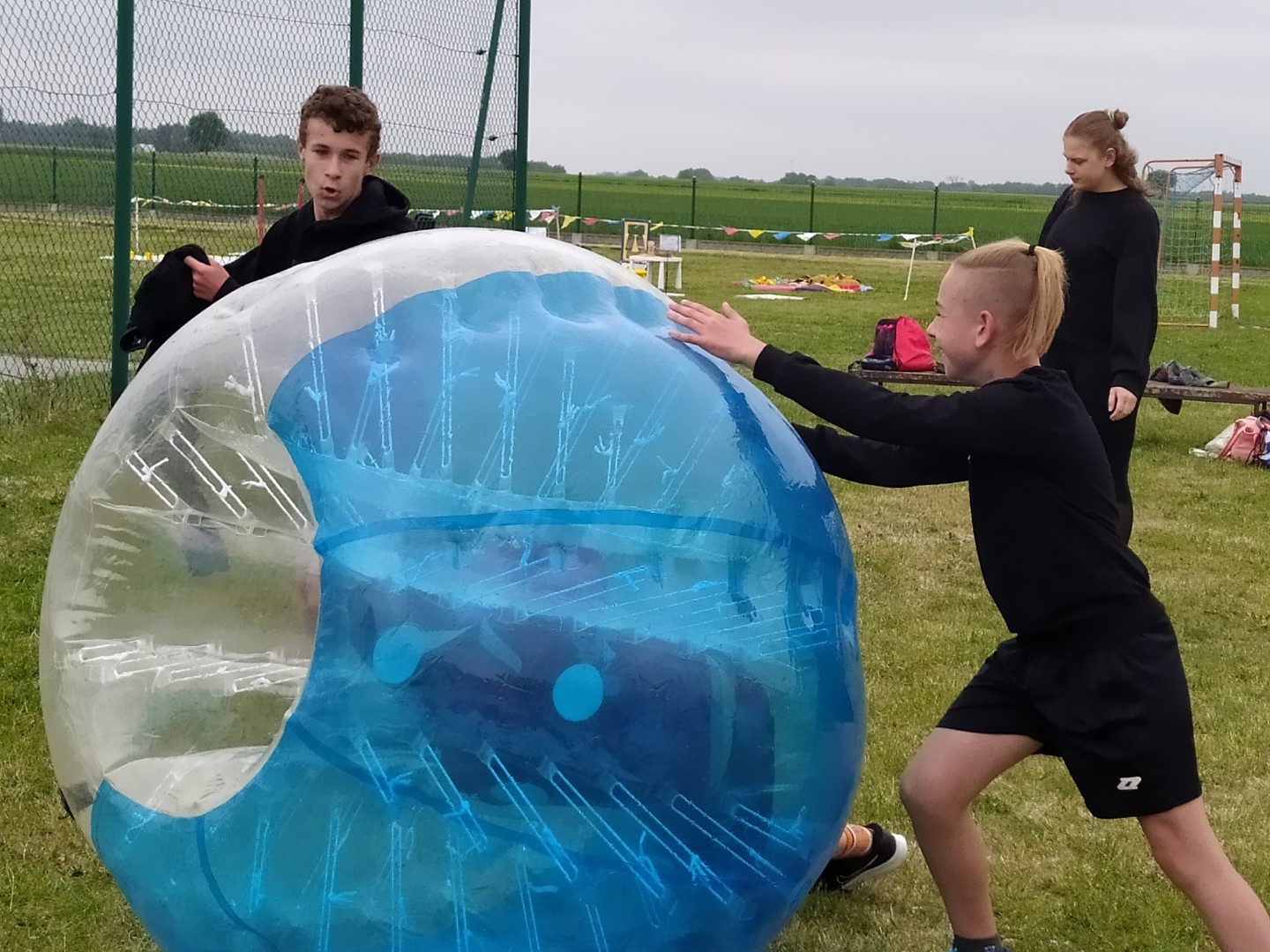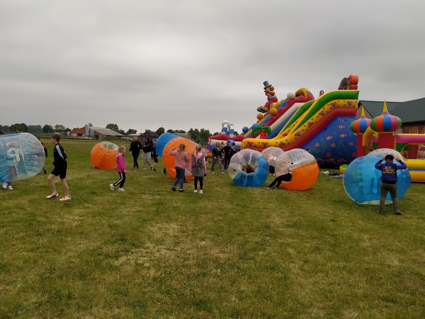 Impreza odbywała się na szkolnych boiskach, jednak echo zabawy roznosiło się po całej okolicy. Już kilka minut po godzinie ósmej entuzjaści piłki nożnej usłyszeli pierwszy gwizdek rozpoczynający turniej piłkarski. Piłka nożna cieszy się coraz większym zainteresowaniem i wzbudza wiele emocji, a liczba fanów tej konkurencji sportowej ciągle wzrasta. Nic więc dziwnego, że rozgrywki przyciągnęły wielu kibiców, którzy dopingowali swoich faworytów oraz cieszyli się ze zwycięstwa  i zdobytych punktów. Dzieciaki mogły wybawić się również na trampolinach. Ponadto (podobnie jak w ubiegłym roku) w szkole gościł „Wesoły Duecik”. Animatorzy przygotowali mnóstwo atrakcji. Były ogromnych rozmiarów bańki mydlane,  konkursy, iluzja, malowanie twarzy oraz dużo muzyki. Niecodzienną darmową atrakcją były również ogromne zjeżdżalnie. Chyba wszyscy skorzystali z „Giganta” i odwiedzili „Chatkę Smerfów”. Maluszki z uśmiechem na twarzy wskakiwały w kolorowe kulki, natomiast trochę starsi sprawdzali swoją sprawność na byczku, który choć trochę nerwowy, nie wyrządził nikomu krzywdy. Dużym powodzeniem cieszyły się dmuchane kule Bumper Ball. Dzięki nim uczniowie, pomimo różnicy wzrostu, mogli biegać, zderzać się ze swymi kolegami oraz bez obaw upadać na ziemię.