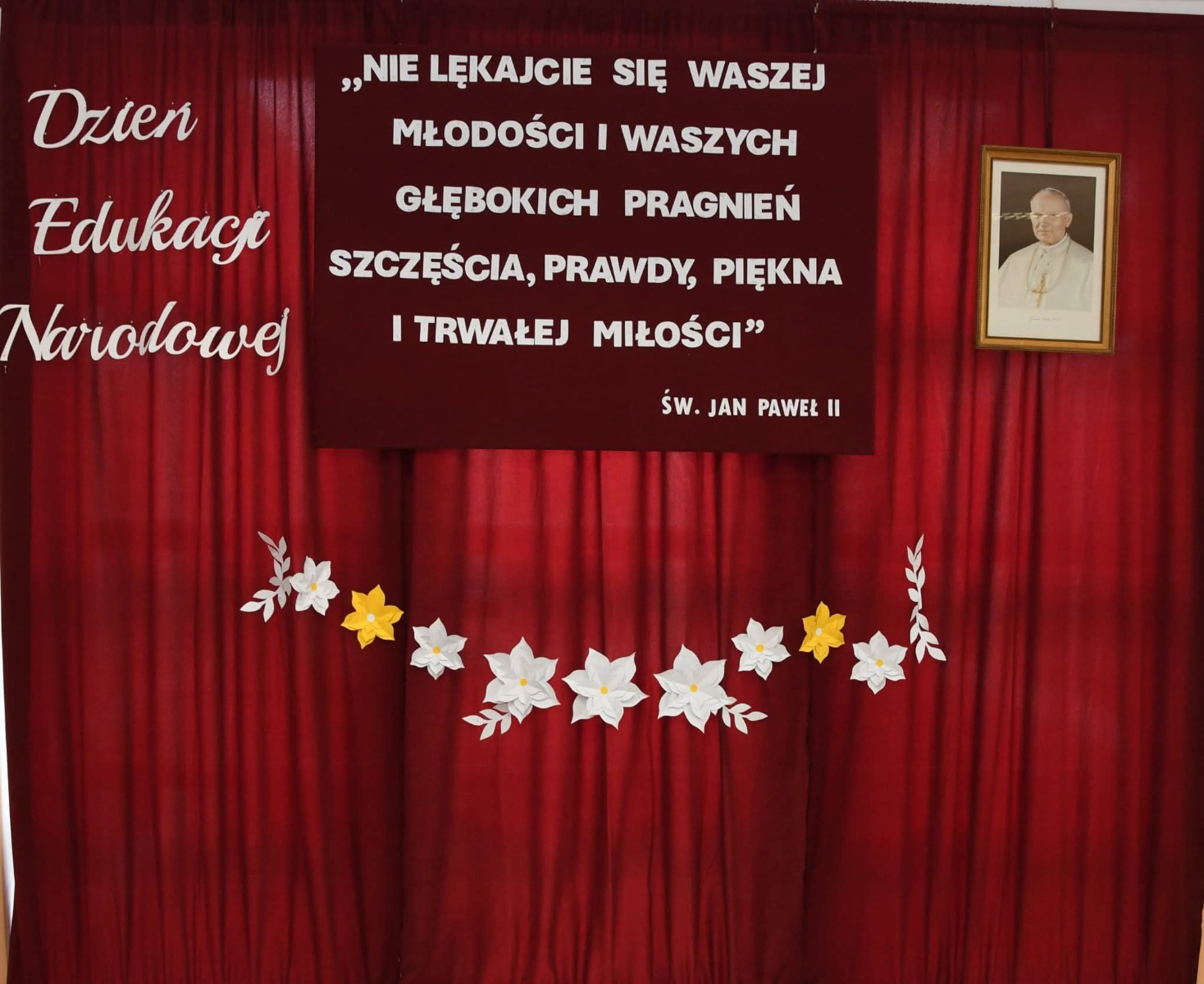 Występom uczniów towarzyszyła prezentacja multimedialna, ukazująca najważniejsze momenty z życia Patrona Szkoły, jak również nawiązująca do historii naszej placówki, dotyczącej nadania imienia. W tym roku minęła 17 rocznica tego ważnego wydarzenia, kiedy to 16.10.2008r. nadano naszej szkole imię Jana Pawła II oraz dokonano uroczystego poświęcenia sztandaru szkoły oraz tablicy pamiątkowej. Sztandar powstał wg projektu pani Renaty Piontkowskiej i pani Ewy Wojtczak, byłej dyrektor szkoły (wyk.: siostry zakonne z Krakowa). Tablica pamiątkowa Patrona Szkoły wykonana została przez Zakład Kamieniarski Dariusza Bednarka z Turku, wg projektu nauczycieli naszej szkoły: Barbary Osiewała i Ewy Wojtczak. Logo Szkoły zaprojektowała pani Barbara Osiewała. Hymn szkoły po raz pierwszy odśpiewaliśmy 16.10.2013r. podczas uroczystości V rocznicy nadania szkole imienia Jana Pawła II. Jego dwie pierwsze zwrotki to Hymn Rodziny Szkół noszących imię Jana Pawła II, natomiast autorem tekstu 3 zwrotki jest nasz absolwent Tomasz Ziółkowski, a autorem tekstu 4 zwrotki pani Renata Piontkowska.
