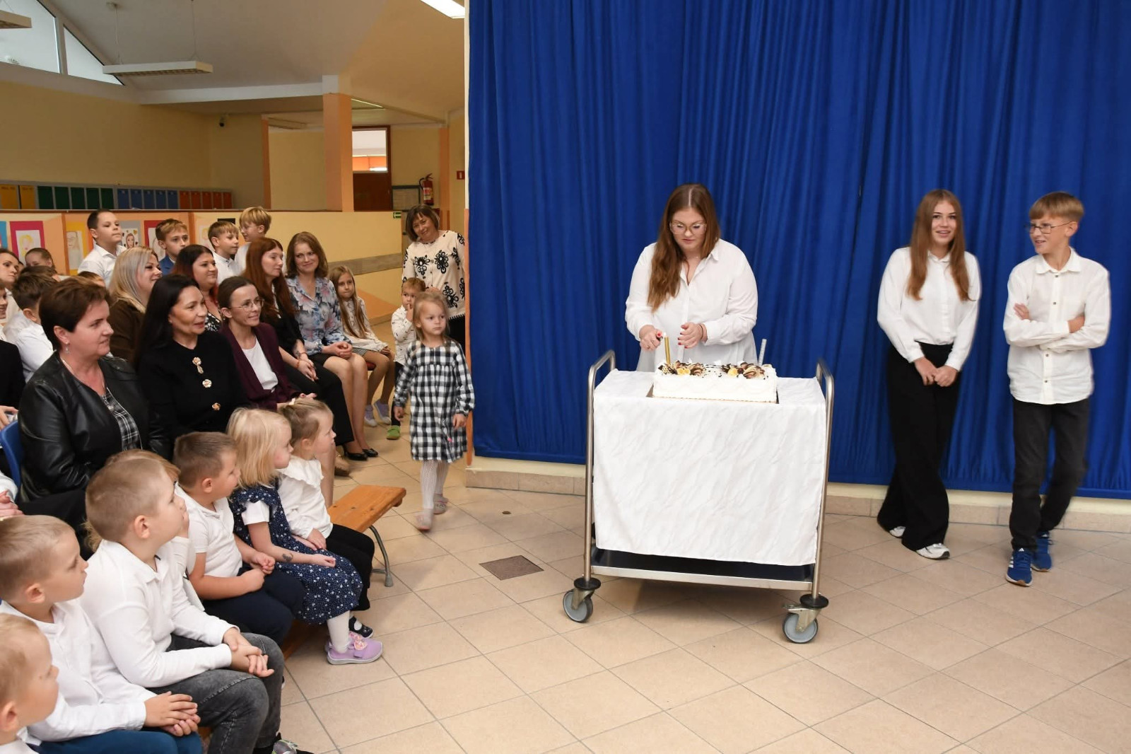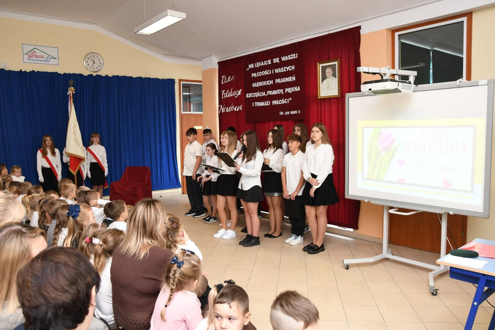 Druga część apelu poświęcona była Dniu Nauczyciela. Przedstawiciele Samorządu Uczniowskiego podziękowali swoim nauczycielom za trud, cierpliwość i codzienne zaangażowanie oraz złożyli serdeczne życzenia. Następnie wszyscy zaśpiewali tradycyjne „Sto lat…”. Słodkim akcentem na zakończenie uroczystości byłokazałytort od Samorządu Uczniowskiego.Z okazji Dnia Edukacji Narodowej również rodzice uczniów przekazali wszystkim nauczycielom i pracownikom szkoły serdeczne podziękowania. W swoich słowach wyrazili wdzięczność za codzienną cierpliwość, wsparcie, życzliwość oraz serce,jakie każdego dnia nauczyciele wkładają w swoją pracę. Rodzice również obdarowali Grono Pedagogiczne tortem. Słodki poczęstunek stał się miłym zwieńczeniem uroczystości i okazją do rozmów, uśmiechów i podziękowań.