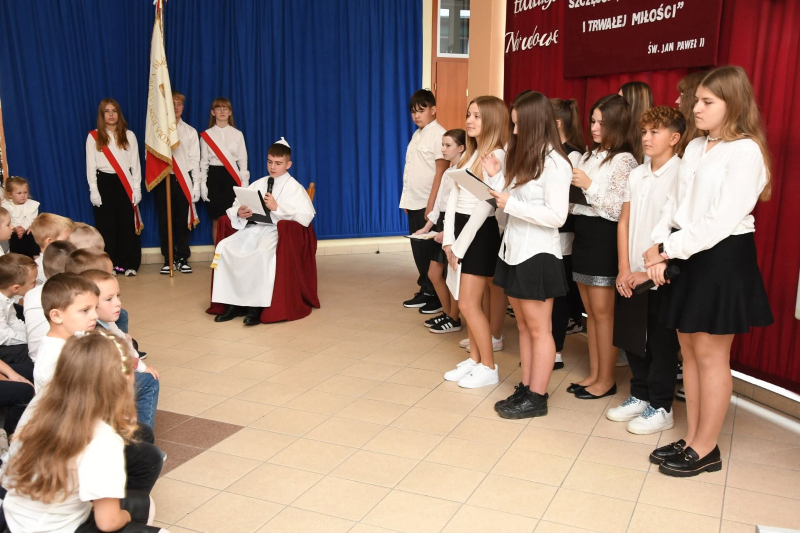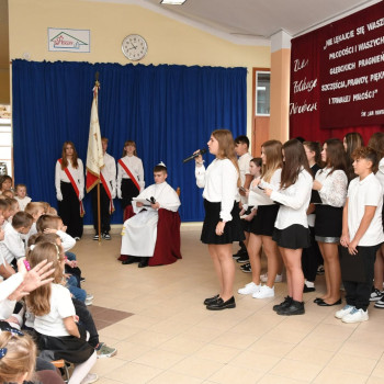 Uroczystość rozpoczęła się wprowadzeniem pocztu sztandarowego oraz wspólnym odśpiewaniem hymnu szkoły. Uczniowie przypomnieli sylwetkę św. Jana Pawła II – Nauczyciela wszechczasów, patrona szkoły, którego nauka i przykład życia nieustannie inspirują kolejne pokolenia młodych ludzi. W montażu słowno-muzycznym znalazły się fragmenty przemówień papieskich, poezja oraz piosenki poświęcone Papieżowi Polakowi.