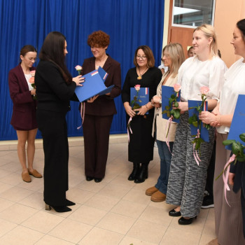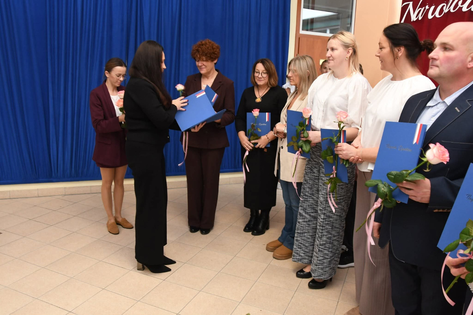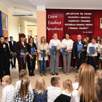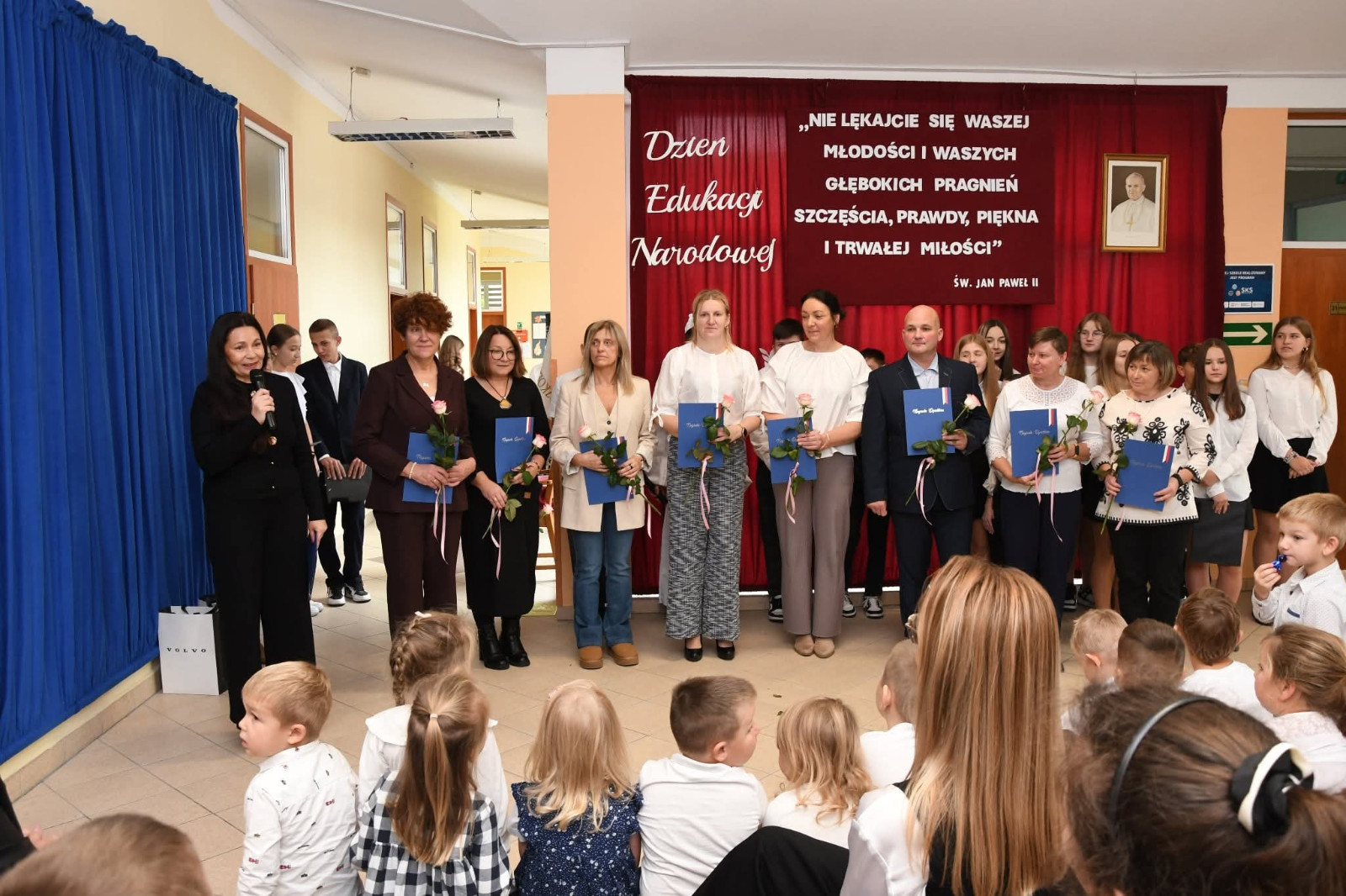 Głos zabrała także Dyrektor Szkoły, pani Katarzyna Miłaczewska, która podziękowała nauczycielom i pracownikom szkoły za ich oddanie i troskę o rozwój uczniów. Podkreśliła, jak ważne jest, by w codziennej pracy kierować się wartościami głoszonymi przez patrona szkoły – miłością, szacunkiem i odpowiedzialnością. Następnie wręczyła nagrody nauczycielom wyróżniającym się w minionym roku szkolnym w pracy dydaktyczno-wychowawczej oraz pracownikom obsługi.