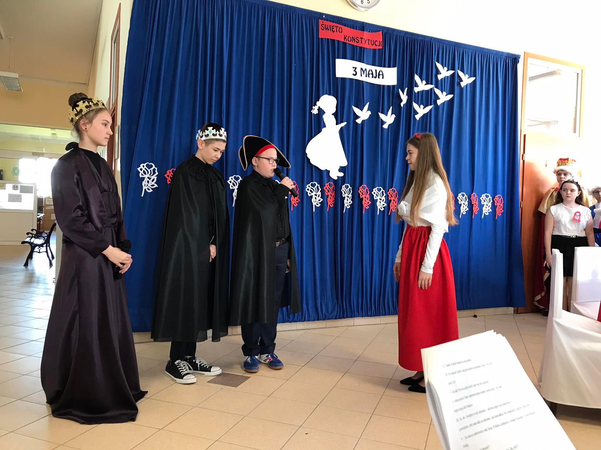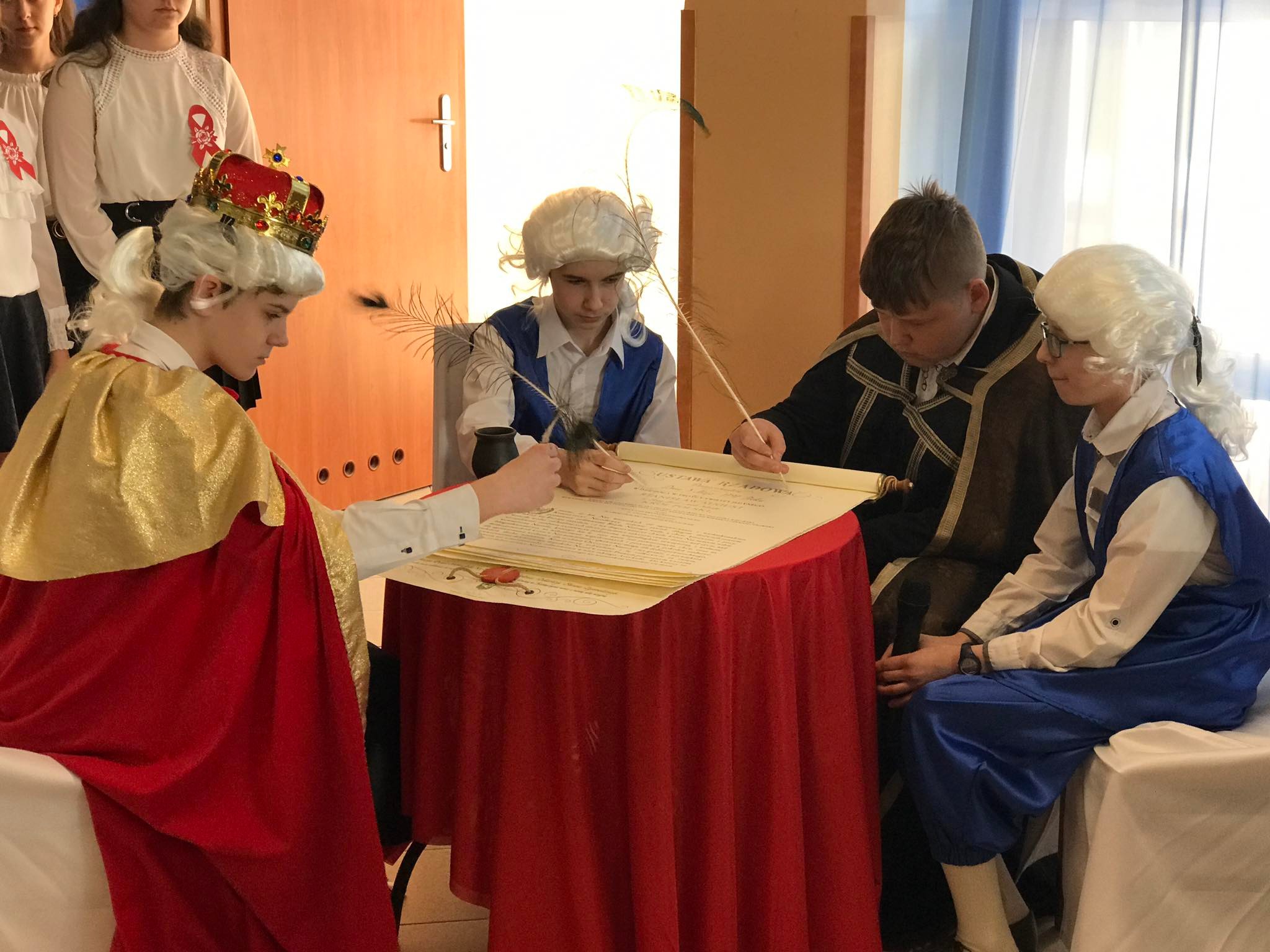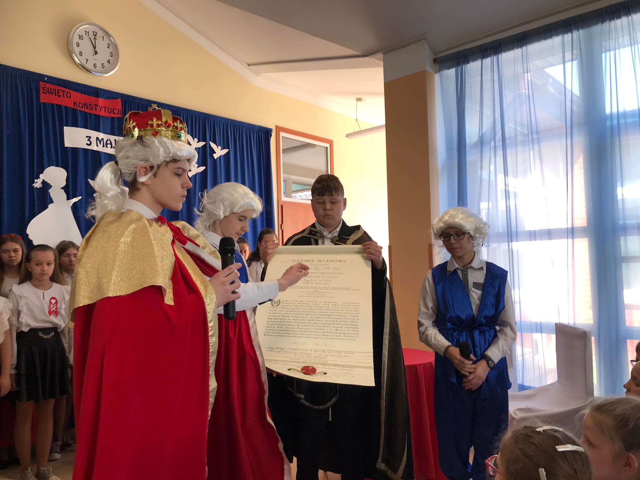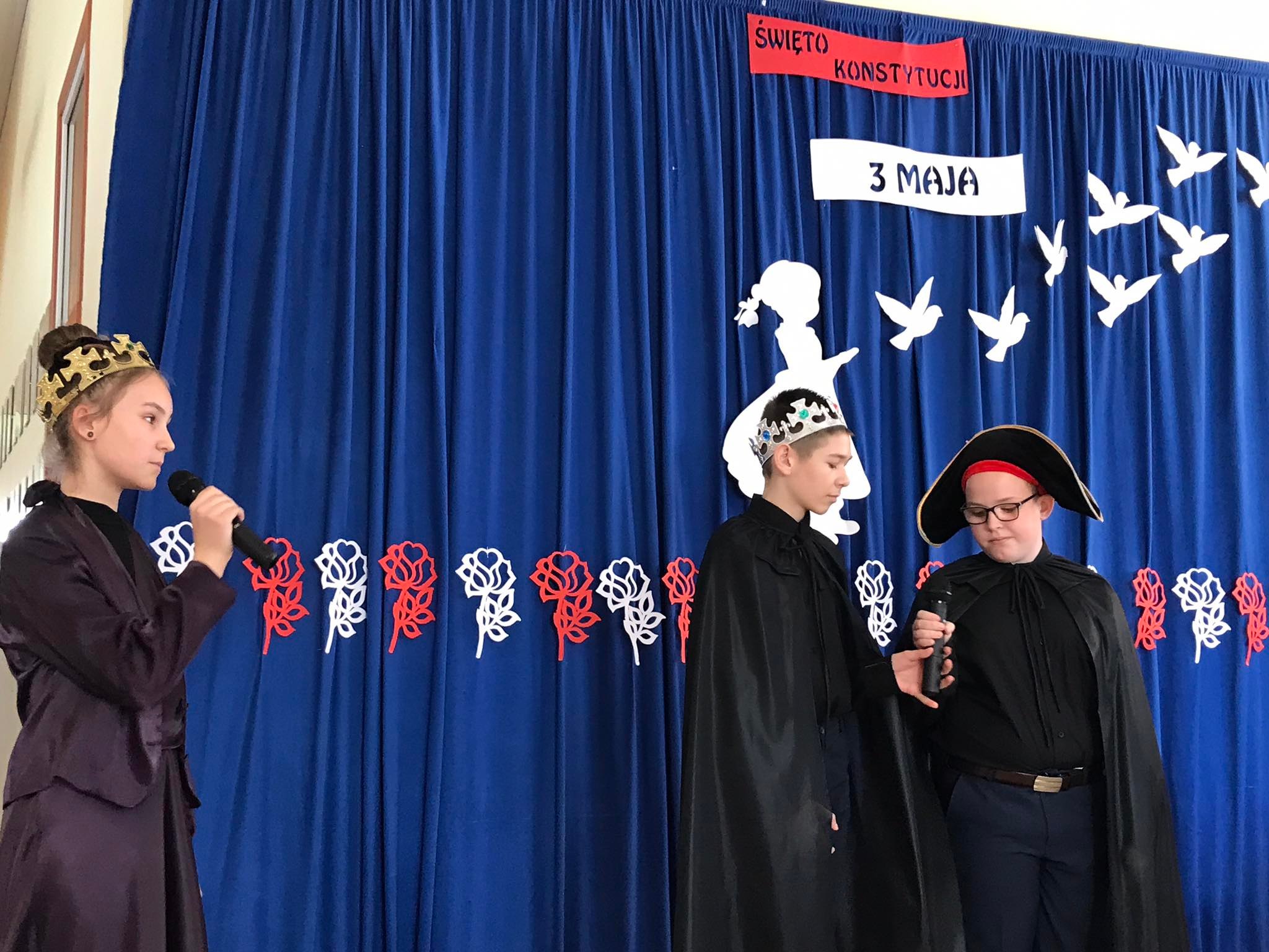 Konstytucja 3 Maja to ważne i piękne święto – święto każdego Polaka. Jest ona ukoronowaniem wszystkiego, co dobre i oświecone w polskiej historii i kulturze. Jest świadectwem na to, że Polacy sami znaleźli siły na przezwyciężenie rozkładu państwa i zdobyli się na wytyczenie drogi, która spotkała się z uznaniem całej postępowej Europy. Pamięć o drugiej w dziejach świata spisanej konstytucji narodowej pomagała podtrzymywać polskie dążenia do niepodległości i tworzyć sprawiedliwe społeczeństwo. Uczniowie i pracownicy Szkoły Podstawowej im. Jana Pawła II w Tokarach Pierwszych nie zapominają o tej ważnej dacie. W związku z powyższym w szkole zorganizowano szereg działań upamiętniających 231. rocznicę uchwalenia Konstytucji 3 Maja. Dzieci przygotowały biało – czerwone flagi oraz piękne kotyliony. Nasza szkoła, pamiętając o tych jakże ważnych dla Polaków wydarzeniach, 29 kwietnia zorganizowała również uroczystą akademię. Uczniowie klas IV - VIII pod kierunkiem pani Małgorzaty Krawczyk przygotowali piękną lekcję historii przypominającą ten doniosły fakt. Apel rozpoczęto wprowadzeniem sztandaru oraz odśpiewaniem hymnu państwowego. Zaprezentowano także historię konstytucji. Przypomniano zebranym, że ten ważny dokument uchwalono na Zamku Królewskim w Warszawie przez Sejm Czteroletni. Uczniowie wcielili się w różne role. Na szkolnej scenie można było zobaczyć m. in.: Ignacego Potockiego, Hugo Kołłątaja, Stanisława Małachowskiego oraz Króla Stanisława Augusta Poniatowskiego. Zwrócono też uwagę na to, że rocznica uchwalenia Konstytucji 3 Maja nazywana jest świętem wolności i radości.