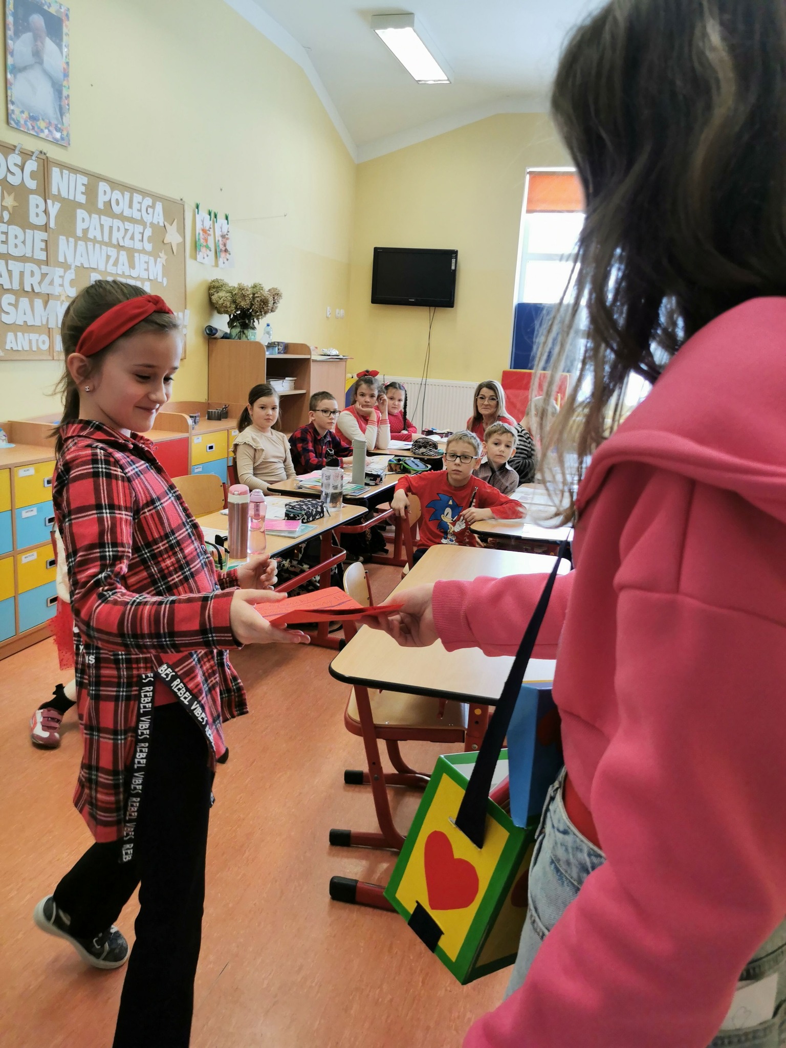 14 lutego, zaraz po dzwonku, po szkole ruszyli nasi niezawodni „szkolni listonosze” – uczniowie z Samorządu Uczniowskiego, którzy z uśmiechem na twarzy roznieśli kartki do poszczególnych klas. Radości nie było końca! Każdy z adresatów otrzymał swoją walentynkę prosto do rąk – niektórym udało się zebrać ich całkiem sporo!