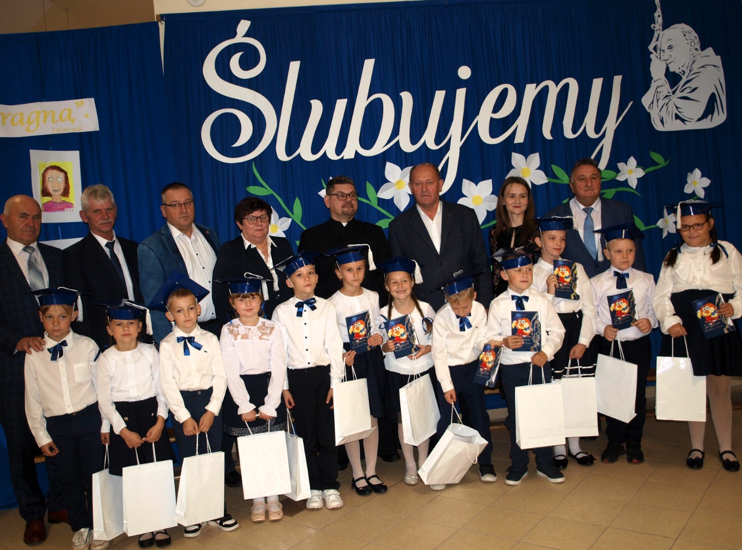 Po części artystycznej pierwszoklasiści w pełni zasłużyli na to, aby dostąpić zaszczytu wstąpienia do grona braci uczniowskiej. W podniosłej atmosferze, na sztandar szkoły, 12 pierwszoklasistów ślubowało godnie reprezentować swoją szkołę, swym zachowaniem i nauką sprawiać radość rodzicom i nauczycielom, być dobrymi Polakami. Następnie uroczystego pasowania na ucznia Szkoły Podstawowej im. Jana Pawła II w Tokarach Pierwszych dokonała Dyrektor Szkoły p. Ewa Wojtczak. Ponadto, każdy pierwszoklasista miał możliwość przypieczętować swoją przysięgę paluszkiem na Akcie ślubowania. Ukoronowaniem aktu ślubowania i pasowania było wręczenie uczniom pierwszego dokumentu - szkolnej legitymacji oraz pamiątkowych dyplomów.