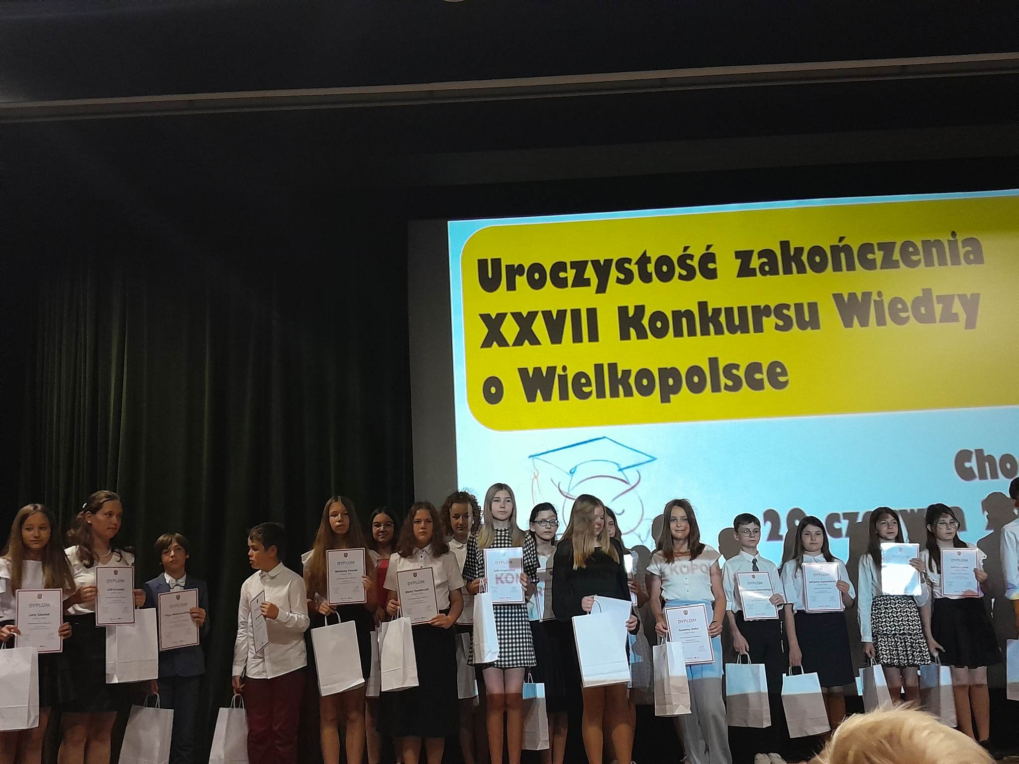 20 czerwca bieżącego roku uczennice klasy V Julia Grzesiak i Lena Zduniak wzięły udział w  uroczystości zakończenia XXVII „Konkursu wiedzy o  Wielkopolsce”, który miał miejsce w Chodzieskim Domu Kultury. Celem Konkursu jest przybliżenie uczniom szkół podstawowych (kl. III – VIII) dziedzictwa kulturowego Wielkopolski, jej historii, flory, fauny, tradycji, gwary i kultury regionalnej, a poprzez to kształtowanie poczucia własnej tożsamości oraz związku z regionem. Obie uczennice zajęły pierwsze miejsca  w wyżej wspomnianym konkursie. Julia i Lena przygotowywały się pod czujnym okiem nauczyciela historii Pani Małgorzaty Krawczyk. Nagrody i dyplomy laureatkom wręczyła Pani kurator Aleksandra Kuś. Zwyciężczyniom gratulujemy i życzymy dalszych sukcesów.