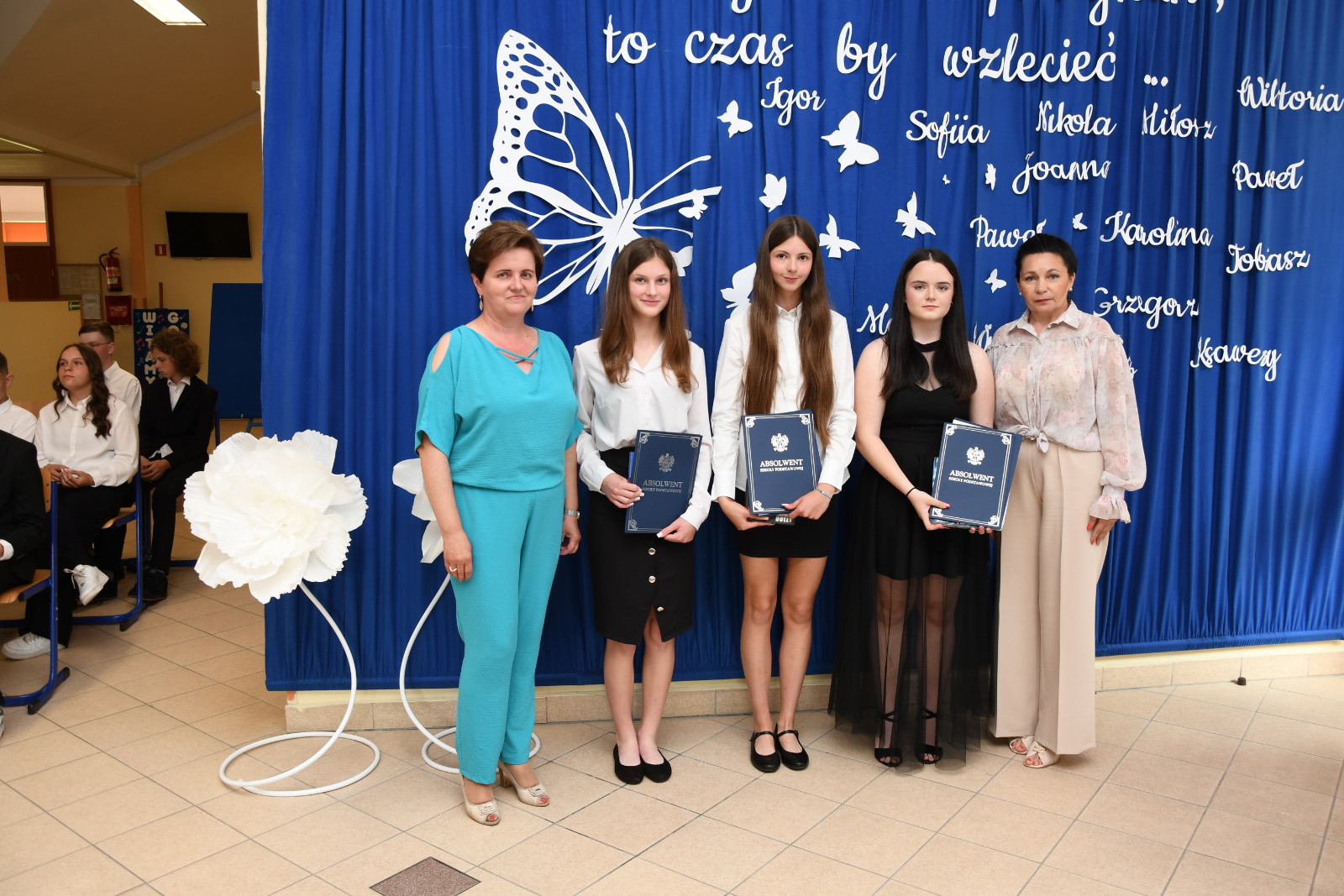 Zakończenie roku szkolnego to również czas, kiedy niektórzy nauczyciele decydują się odejść na zasłużoną emeryturę. W tym roku decyzję o opuszczeniu murów naszej szkoły podjęła pani Laura Adamiak, nauczyciel edukacji wczesnoszkolnej i oligofrenopedagog. Pani dyrektor Katarzyna Miłaczewska skierowała do pani Laury szczególne słowa podziękowań. Dziękowała jej za profesjonalizm, cierpliwość, serdeczność i uśmiech. Podkreśliła, że pani Laura Adamiak przez lata z ogromnym zaangażowaniem i pasją kształtowała najmłodsze umysły, ucząc nie tylko liter i liczb, ale także życiowych wartości,  szacunku do przeszłości i piękna ojczystego języka. Jej cierpliwość, ciepło i mądrość zostawiły trwały ślad w sercach wielu dzieci oraz nas wszystkich. Pani dyrektor życzyła, aby ten nowy etap życia przyniósł pani Laurze wiele radości oraz spokoju, by każdy dzień był pełen uśmiechu, inspiracji i odpoczynku, by obfitował w podróże, przygody i chwile pełne wrażeń.