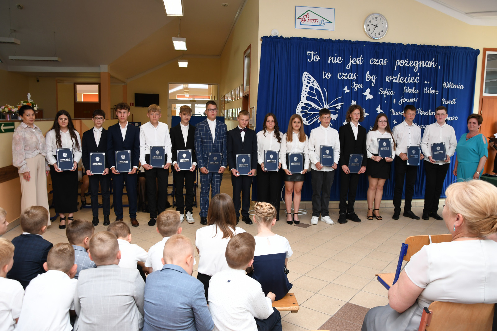Na koniec ósmoklasiści wierszem i piosenką podziękowali pani dyrektor, swojej wychowawczyni, nauczycielom, wszystkim pracownikom szkoły i rodzicom za ich trud, cierpliwość i poświęcenie włożone w pracę. Wzruszający apel przygotowany pod czujnym okiem pani Urszuli Jarentowskiej sprawił, że nawet największym twardzielom kręciła się łza w oku. Po oficjalnej części uroczystości zaproszeni goście, pracownicy szkoły oraz uczniowie klasy ósmej udali się na słodki poczęstunek. Przy wspólnym stole nie zabrakło rozmów, uśmiechów i wspomnień. Choć szkolne dzwonki na chwilę ucichły, a tornistry trafiły na dno szafy, to pamięć  o minionych miesiącach zostanie z nami na długo. Każdy dzień spędzony w szkolnych ławkach był krokiem ku dorosłości, nauką nie tylko z podręczników, ale i życia. Teraz nadszedł czas zasłużonego odpoczynku – by zebrać siły, naładować baterie i wrócić z nową energią. Życzymy wszystkim uczniom, nauczycielom i rodzicom pięknych, bezpiecznych wakacji – pełnych słońca, uśmiechu i fantastycznych przygód.