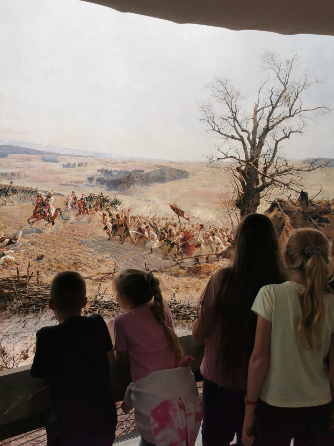 Po smacznym posiłku w McDonald’s ponownie spotkaliśmy się z panem przewodnikiem, który opowiedział nam o wybitnym dziele Jana Styki i Wojciecha Kossaka namalowanym dla uczczenia setnej rocznicy insurekcji kościuszkowskiej. Panorama Racławicka ukazuje artystyczną wizję przebiegu bitwy pod Racławicami, stoczonej w okolicach wsi Racławice, Dziemięrzyce i Janowiczki. Pejzaż z tych miejsc przedstawiony został realistycznie wg fotografii oraz szkiców terenowych wykonanych w kwietniu 1893 roku. Obraz ukazuje najważniejsze zdaniem twórców momenty bitwy w sposób asynchroniczny. Na płótnie występują więc jednocześnie sceny, które występowały w różnym czasie. Wiele ważnych momentów bitwy nie zostało przedstawionych, natomiast pojawiły się sceny, które w czasie bitwy nie miały miejsca. Panorama Racławicka zachwyciła wszystkich uczestników wycieczki. Uczniowie jednogłośnie stwierdzili, że jest to najpiękniejsza panorama, jaką kiedykolwiek widzieli.