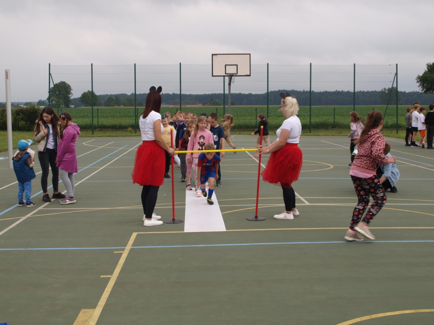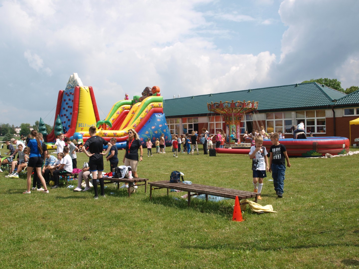 W naszej szkole Dzień Dziecka obchodziliśmy 3 czerwca. Tego dnia uczniów przywitała radosna muzyka i kolorowa chmura z baniek mydlanych. Tuż po godzinie 9:00 dzieci pod opieką swoich wychowawców udały się na szkolne boiska, które już od samego rana zamieniły się w gigantyczny plac zabaw. Tam atrakcji nie brakowało. Ogromnym powodzeniem wśród naszych milusińskich cieszył się duet pod nazwą „M.G. Rozrywka”. Animatorki przygotowały mnóstwo atrakcji. Były tory przeszkód, konkursy, iluzja, malowanie twarzy oraz dużo muzyki. Dzieci chętnie angażowały się w różnego typu rywalizacje, tym bardziej, że na zwycięzców czekały gromkie brawa kibiców. Niecodzienną darmową atrakcją były również ogromne zjeżdżalnie i tor wspinaczkowy zaproponowane przez firmę „Delfinek”. Najmłodsi z uśmiechem na twarzy „fruwali” na karuzeli, natomiast trochę starsi sprawdzali swoją sprawność na byczku, który tego dnia nie miał zamiaru używać swoich rogów. Dużym powodzeniem cieszyły się też dmuchane kule Bumper Ball. Dzięki nim uczniowie, pomimo różnicy wzrostu, mogli biegać, zderzać się ze swymi kolegami oraz bez obaw upadać na ziemię. Niesamowitą atrakcją (podobnie jak w ubiegłym roku) były Alpaki Z Zagrody Milejów. Dzieci z wielkim zainteresowaniem słuchały opowieści państwa Iwony i Rafała Babiarczyków o tych uroczych zwierzętach. Ponadto mogły je głaskać, przytulać, karmić, a nawet z nimi spacerować. Odważni mogli też przejechać się konno na Gazelce ze Stajni w Chrapczewie.