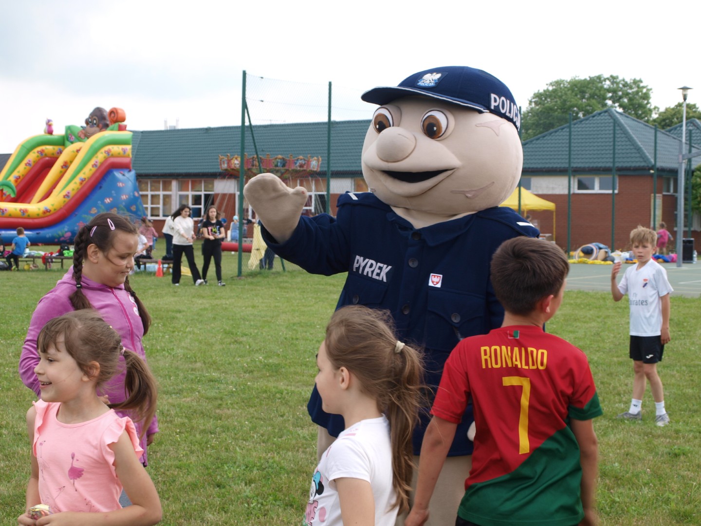 Około godziny 10:00 na boisku pojawił się policyjny samochód z Komendy Powiatowej Policji w Turku. Dzieci miały wielką frajdę, ponieważ mogły poznać wyposażenie radiowozu oraz założyć alkogogle, które symulują zaburzenia jakich doznaje osoba po spożyciu alkoholu, a więc: obniżenie koncentracji, spowolnienie czasu reakcji, trudności z określeniem kierunków, zniekształcenie widzianego obrazu, zaburzenie w ocenie odległości i podwójne widzenie. W innych częściach placu zabaw odbywało się malowanie twarzy oraz dekorowanie tatuażami wodnymi i z brokatu. Można tam było również otrzymać wesołe naklejki, które cieszyły się ogromnym zainteresowaniem nie tylko dzieci, ale również młodzieży i dorosłych. Wielu uczniów, chcąc wnieść swój wkład w imprezę, popisywało się swoimi umiejętnościami i kondycją fizyczną podczas rozgrywek sportowych. Piłka nożna jest naszym sportem narodowym. Nawet pomimo tego, że przez ostatnie lata zdecydowanie większe sukcesy odnosimy w siatkówce, skokach narciarskich czy lekkoatletyce, to mecze piłkarskie elektryzują największe rzesze kibiców. Nic więc dziwnego, że futbol jest tak popularny również wśród uczniów naszej szkoły – coraz częściej nie tylko chłopców, ale też dziewczynek. Rozgrywki przyciągnęły wielu kibiców, którzy dopingowali swoich faworytów oraz cieszyli się ze zwycięstwa i zdobytych punktów. Do wspólnej zabawy z uczniami, rodzicami i nauczycielami dołączył również pan Jan Gruca. Wójt Gminy Kawęczyn wręczył Patrycji Sęk, uczennicy klasy VII, dyplom oraz nagrodę za zdobycie III miejsca w konkursie ekologicznym finansowanym w ramach projektu „Wspólnie włączamy ekologiczne myślenie – razem możemy więcej – edukacja ekologiczna mieszkańców Gminy Kawęczyn”.