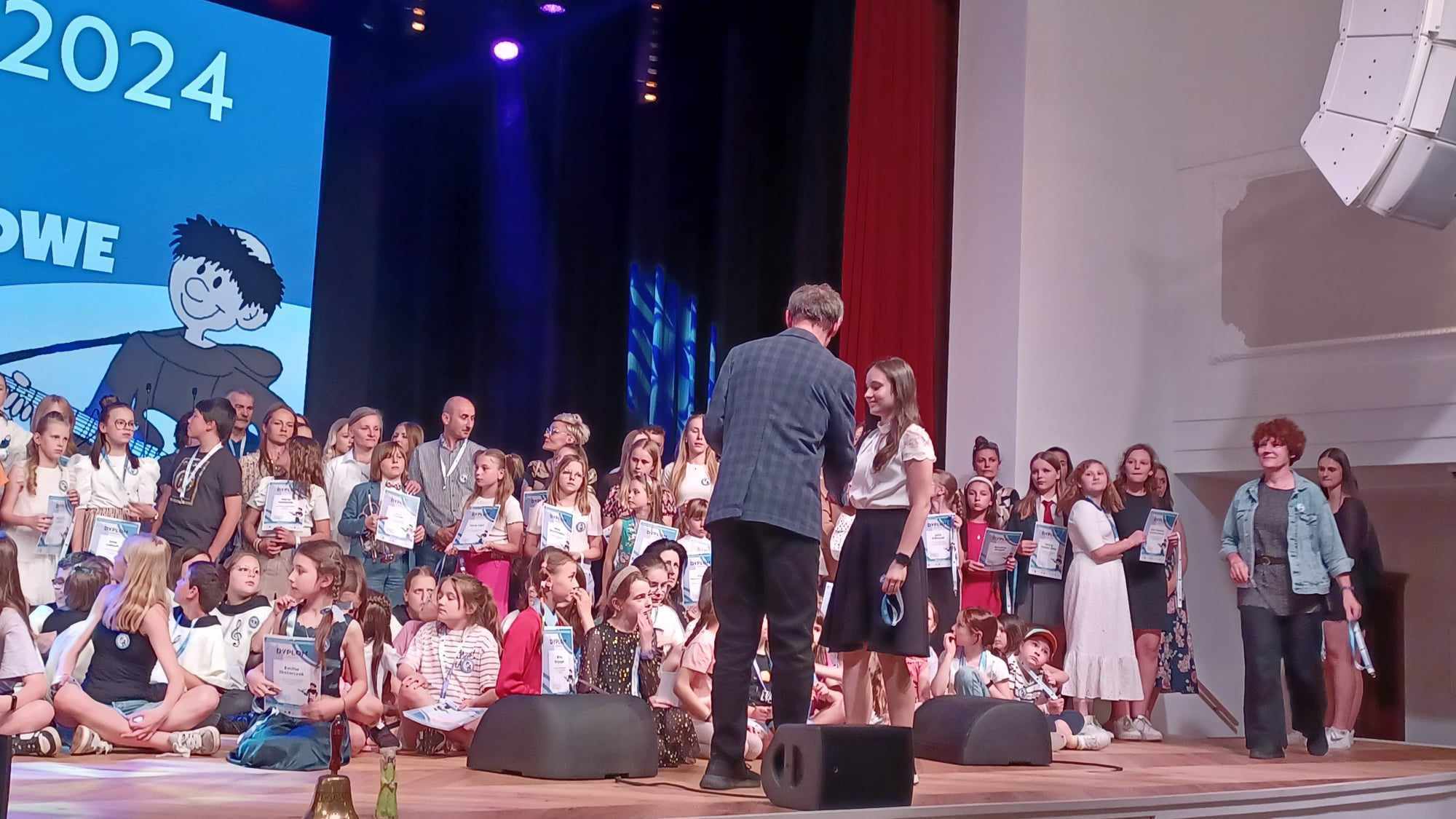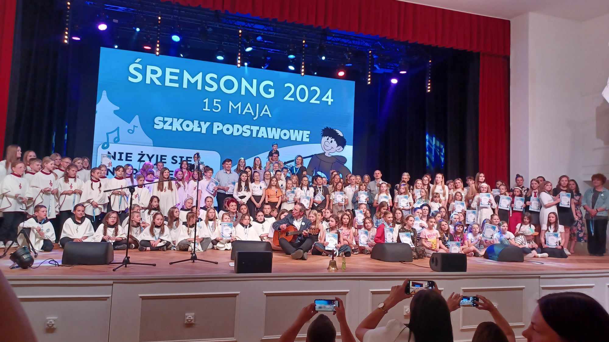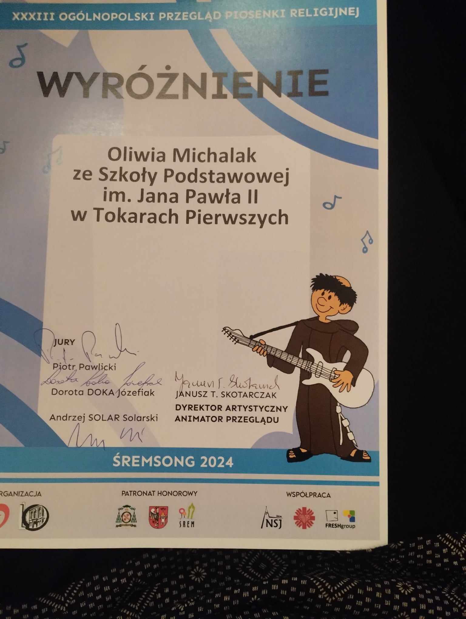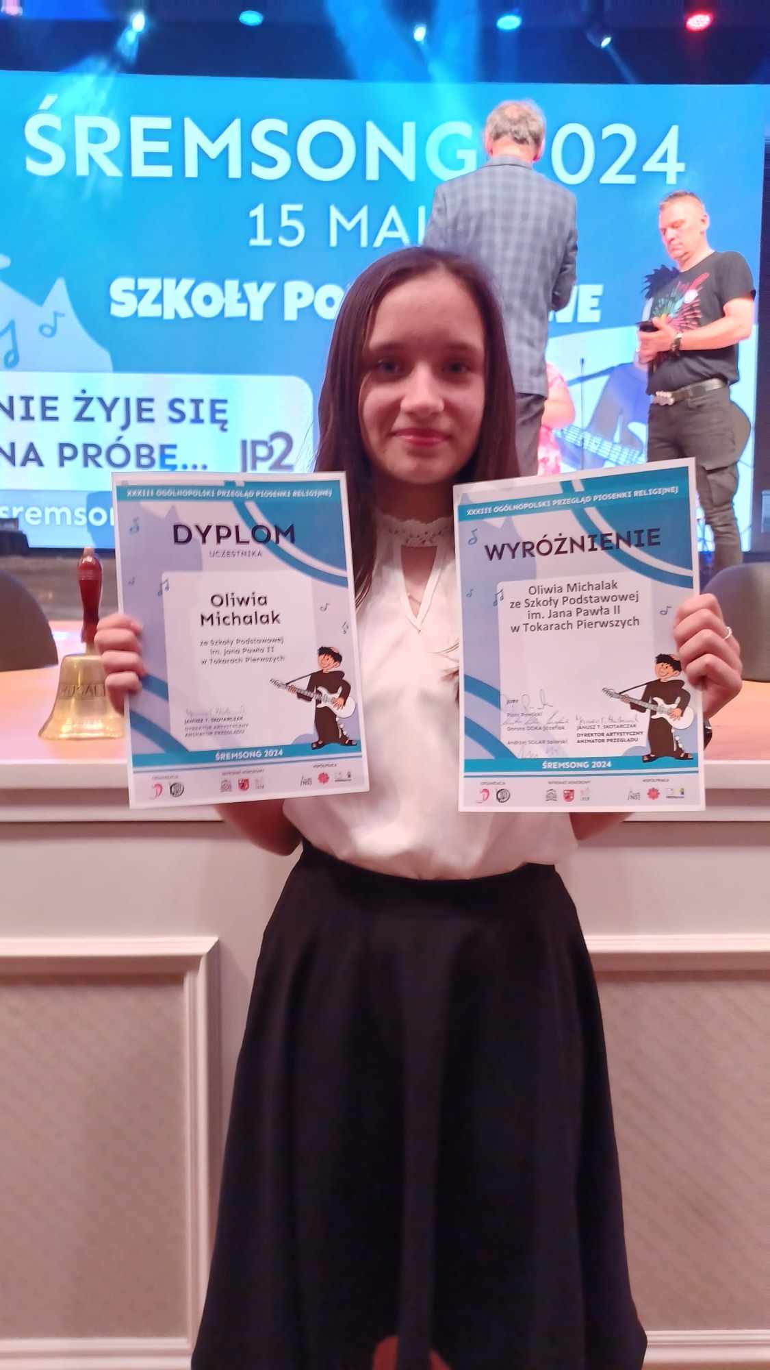 Uczennica klasy VI – Oliwia Michalak, reprezentowała naszą szkołę w 33 Ogólnopolskim Przeglądzie Piosenki Religijnej ŚREMSONG 2024 – jednym z największych przeglądów religijnych w Polsce. Organizatorem Przeglądu było Katolickie Centrum Edukacji i Kultury im. Św. Jana Pawła II w Śremie oraz Liceum Ogólnokształcące im. Gen. Józefa Wybickiego w Śremie. Tegoroczna edycja odbyła w dniach 13 – 19 maja wraz z towarzyszącymi Przeglądowi: spotkaniem młodych, Koncertem Galowym z udziałem Laureatów i Mszą Świętą na zakończenie. W trakcie pierwszego dnia na scenie wystąpiły przedszkolaki, drugiego i trzeciego dnia swoje talenty zaprezentowali uczniowie szkół podstawowych, kolejnego dnia – uczniowie szkół ponadpodstawowych i uczelni wyższych. Przewodniczącym jury był Piotr Pawlicki, ceniony autor piosenek, dyrygent chórów gospel oraz laureat wielu ogólnopolskich festiwali muzycznych. W składzie byli również: Dorota „DOKA” Józefiak – wokalistka, kompozytorka i autorka tekstów oraz Andrzej „SOLAR” Solarski, doświadczony basista i muzyk, który współpracował z wieloma znakomitościami polskiej sceny muzycznej. Oliwia pięknie zaprezentowała piosenkę Tomasza Kamińskiego pt. „Ty tylko mnie poprowadź” i wyśpiewała sobie nagrodę w postaci wyróżnienia. Ogromne gratulacje i życzenia dalszych sukcesów muzycznych!