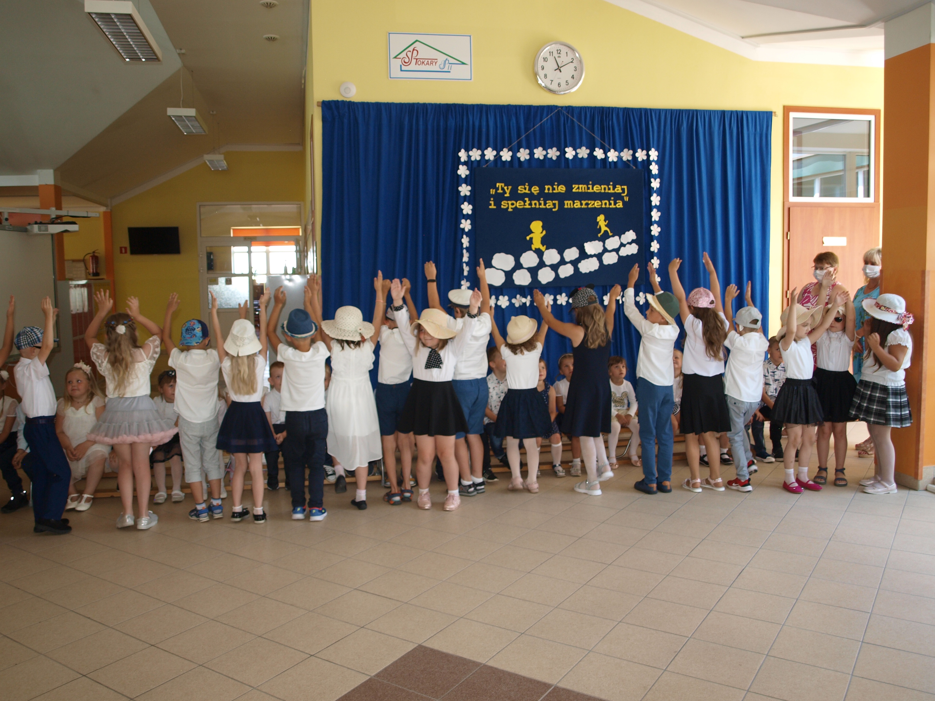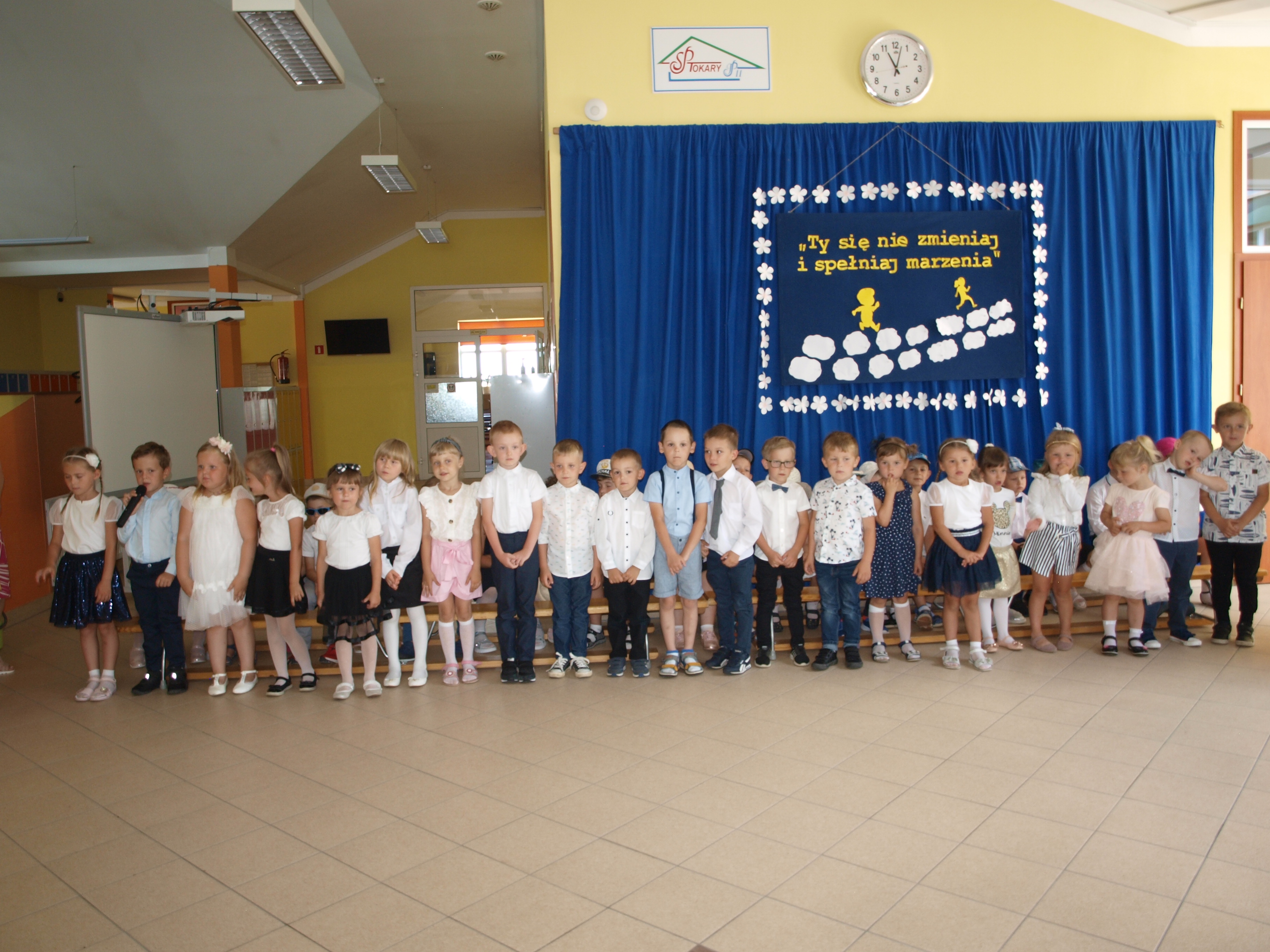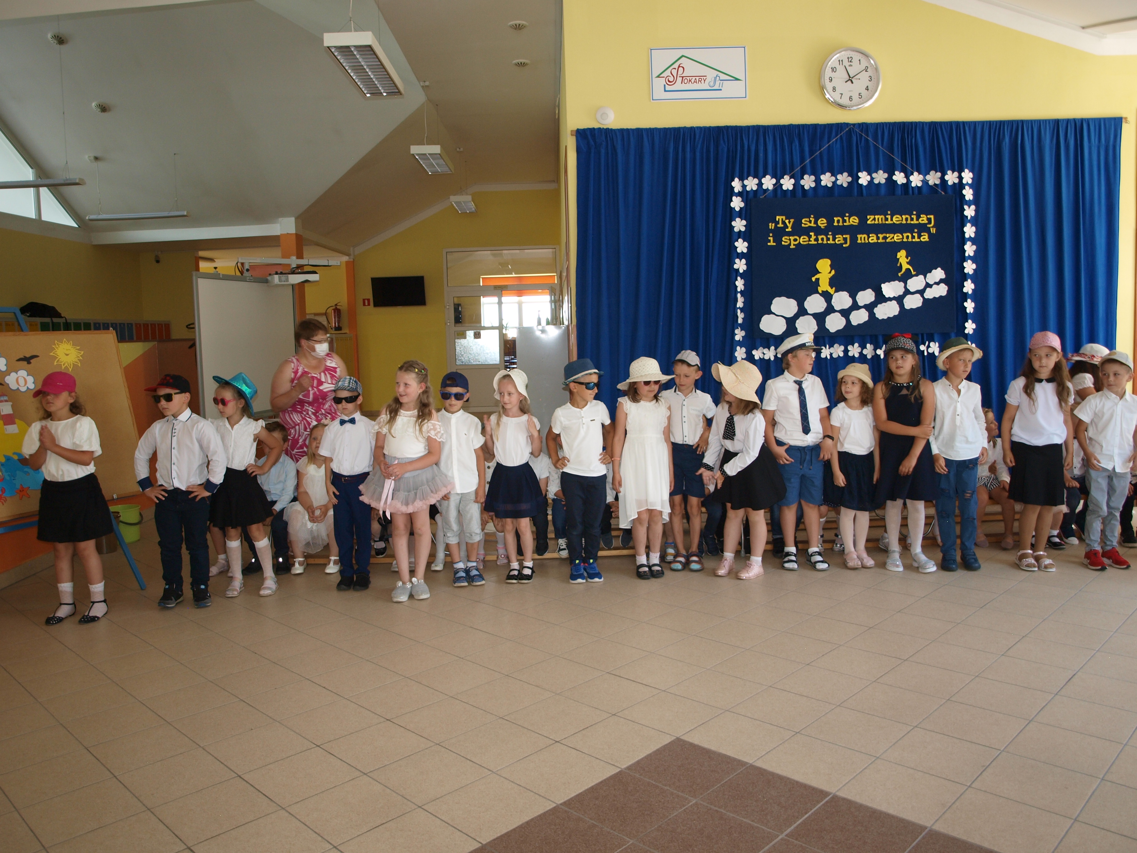 24 czerwca 2021r. o godz. 11:00 w naszej szkole odbyło się uroczyste zakończenie przedszkola. Przedszkolacy z dwóch grup zaprezentowały część artystyczną. Recytowały pięknie wakacyjne wiersze, śpiewały piosenki oraz zatańczyły układ taneczny. Dzieci otrzymały pamiątkowe dyplomy, a rodzice zakupili dla swoich pociech prezenty: odznaki „Wzorowy przedszkolak” i książeczki dla młodszych dzieci, odznaki „Żegnaj zerówko – Tokary Pierwsze 2021” oraz cukierki w cukierku dla starszych dzieci. Na zakończenie były życzenia, przestrogi wakacyjne, bogate bukiety kwiatów dla pań, pamiątkowe zdjęcia oraz słodki poczęstunek przygotowany przez rodziców.