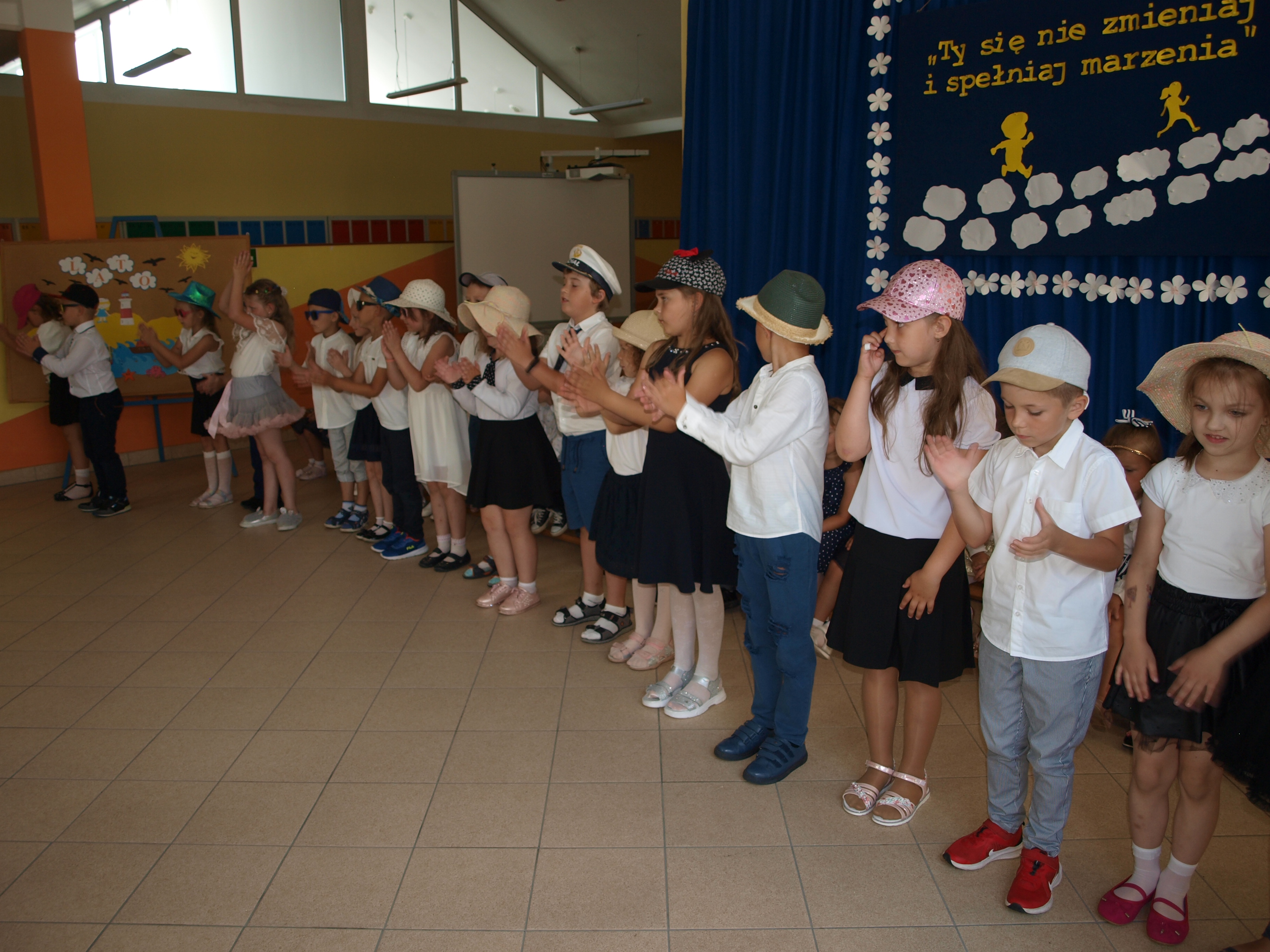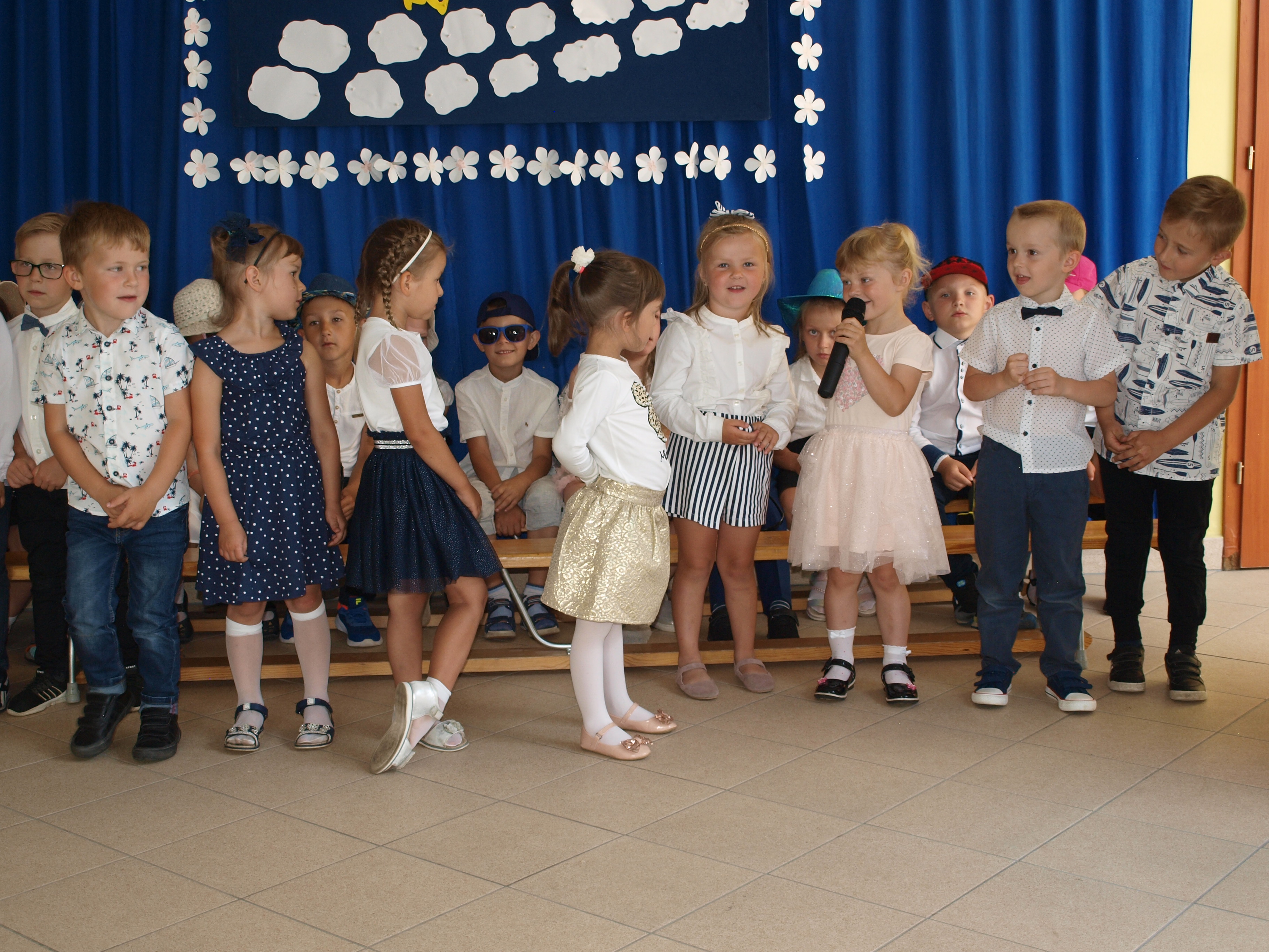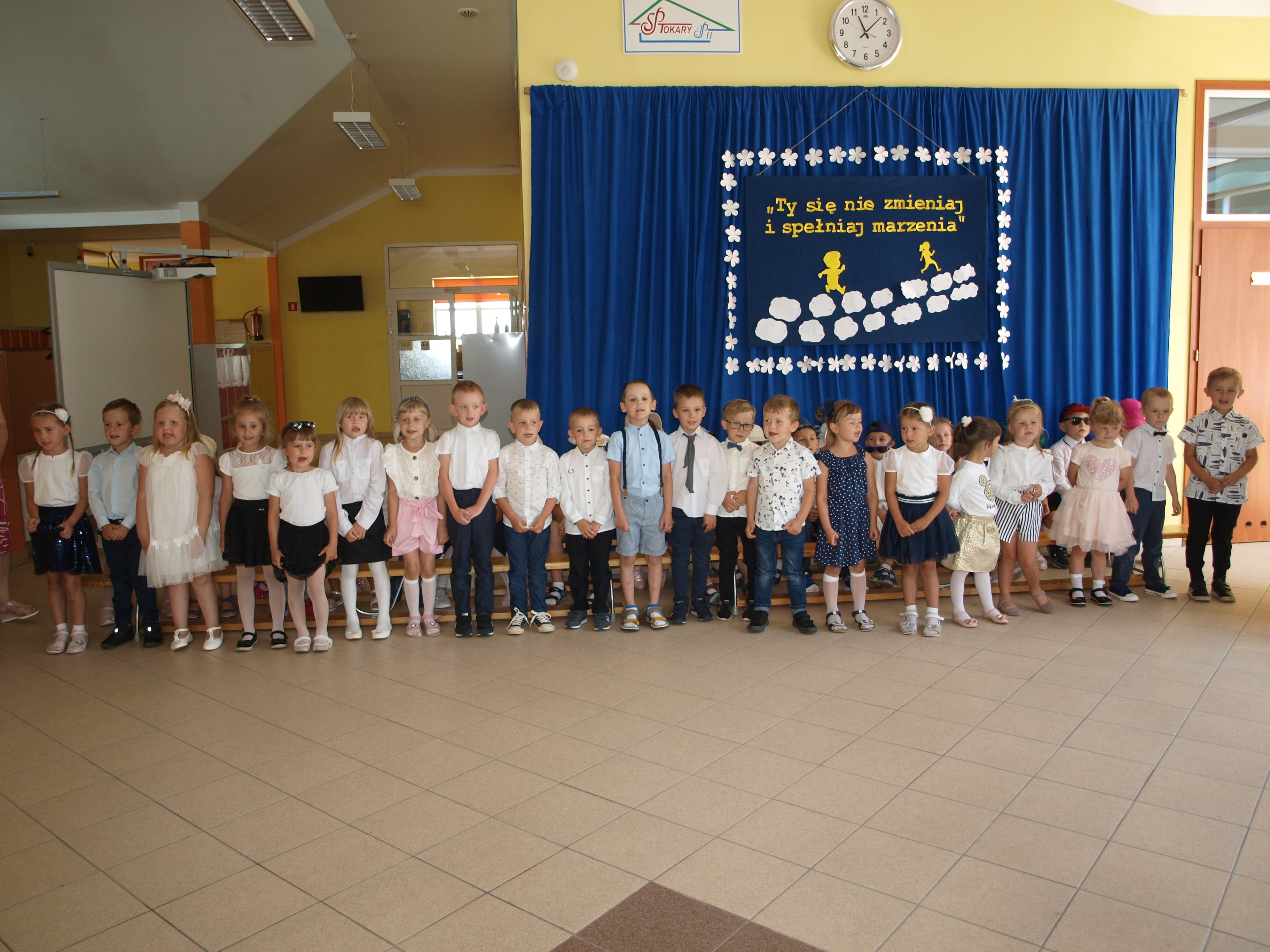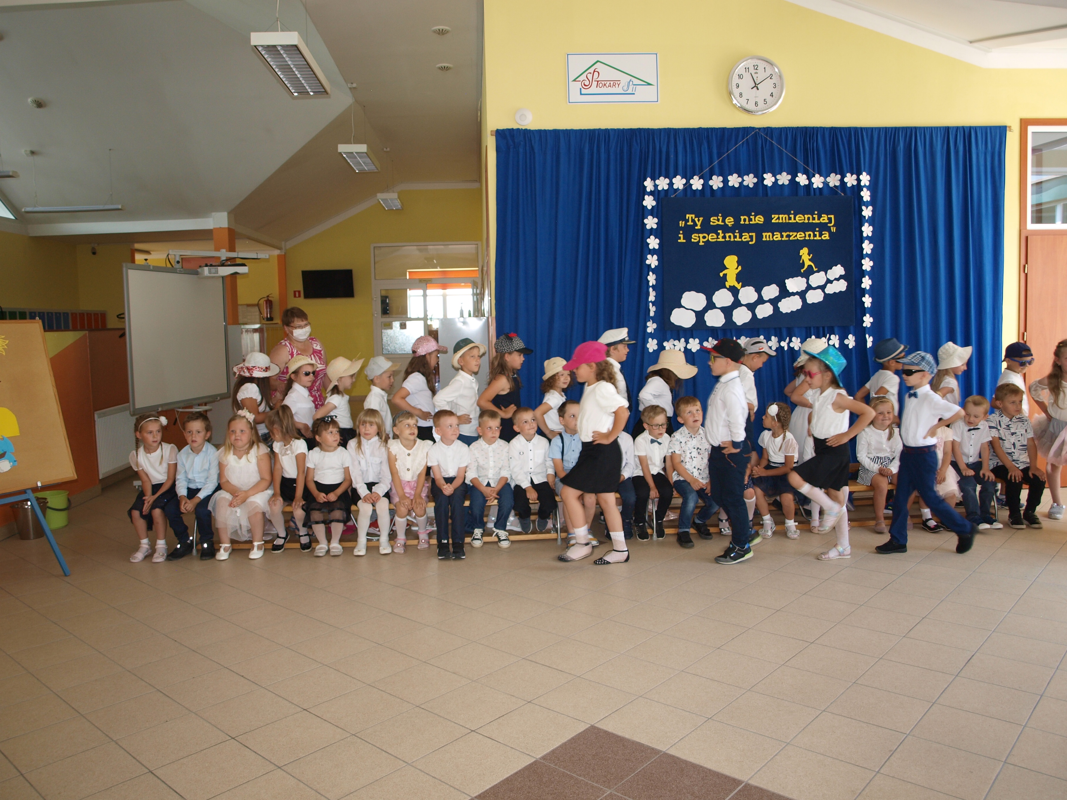 24 czerwca 2021r. o godz. 11:00 w naszej szkole odbyło się uroczyste zakończenie przedszkola. Przedszkolacy z dwóch grup zaprezentowały część artystyczną. Recytowały pięknie wakacyjne wiersze, śpiewały piosenki oraz zatańczyły układ taneczny. Dzieci otrzymały pamiątkowe dyplomy, a rodzice zakupili dla swoich pociech prezenty: odznaki „Wzorowy przedszkolak” i książeczki dla młodszych dzieci, odznaki „Żegnaj zerówko – Tokary Pierwsze 2021” oraz cukierki w cukierku dla starszych dzieci. Na zakończenie były życzenia, przestrogi wakacyjne, bogate bukiety kwiatów dla pań, pamiątkowe zdjęcia oraz słodki poczęstunek przygotowany przez rodziców.