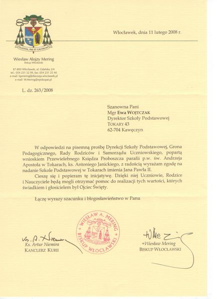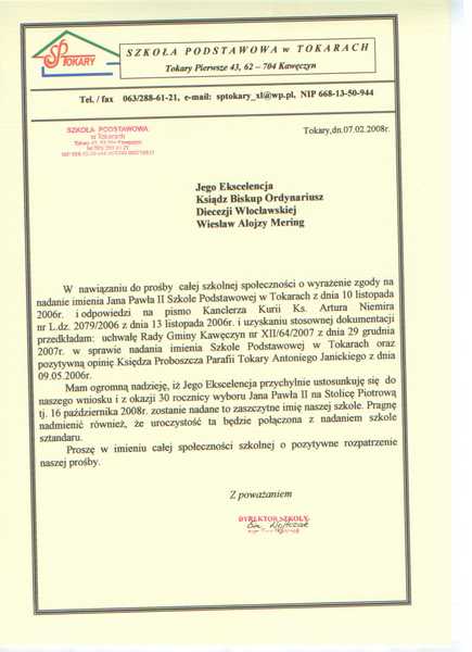 - ponowne wystąpienie w dniu 7 lutego 2008r. z wnioskiem do Kurii Biskupiej we Włocławku o zgodę w sprawie nadania Szkole Podstawowej w Tokarach imienia Papieża Jana Pawła II.